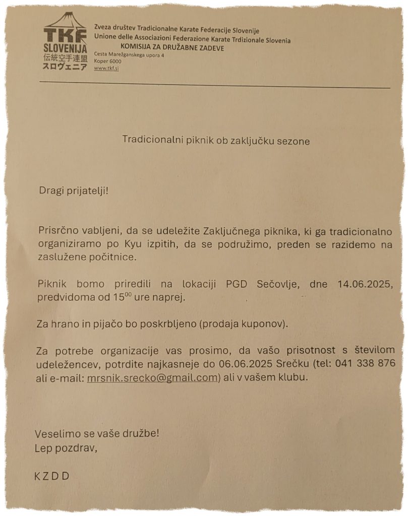 Kyu izpiti TKF Slovenije! 05. Jun 2025 Izpiti OŠ Sečovlje,14,junija(sobota) 2025 s pričetkom ob 10.00h! Po izpitih sledi zaključek sezone, piknik….veselo druženje za vse, ……..mlade in starejše karateke, simpatizerje, podpornike… člane družin…..! VABLJENI!