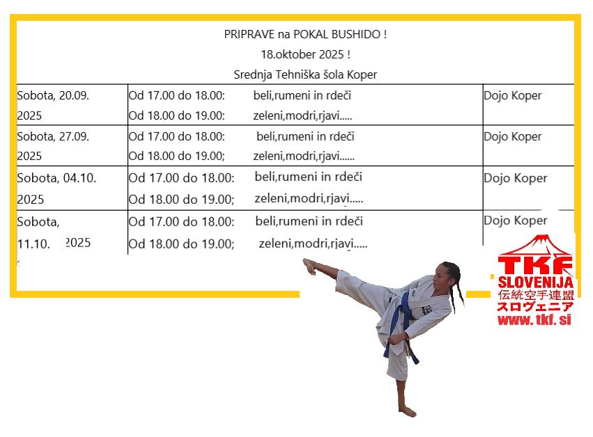 Po koledarju TKF Slovenije bo v soboto,18.oktobra 2025 na Srednji tehniški šoli v Kopru potekal 3.karate pokal Mladi upi – Bushido 2025! Tehnični organizator je TKS Bushido iz Ankarana, tekmovanje…