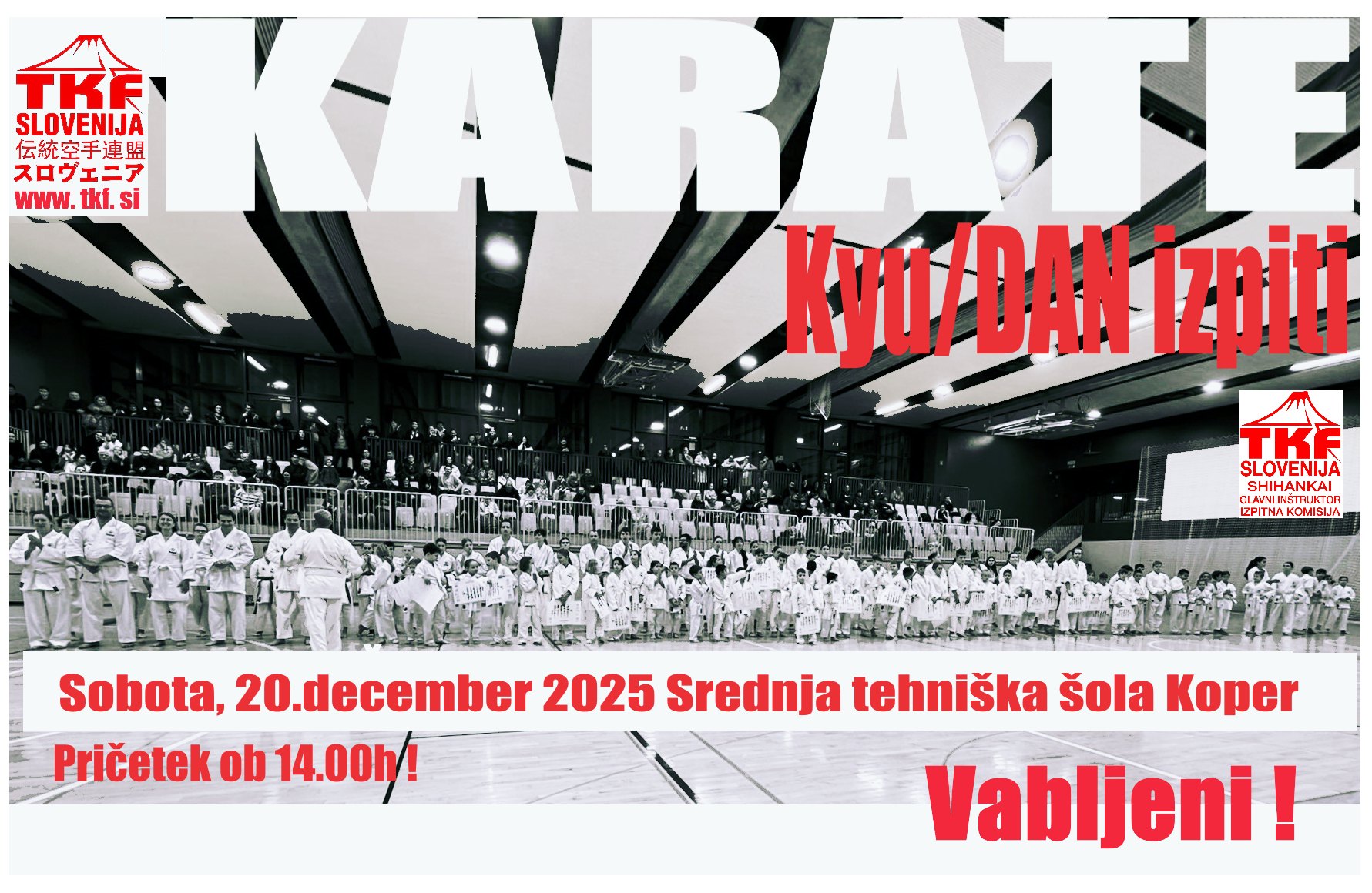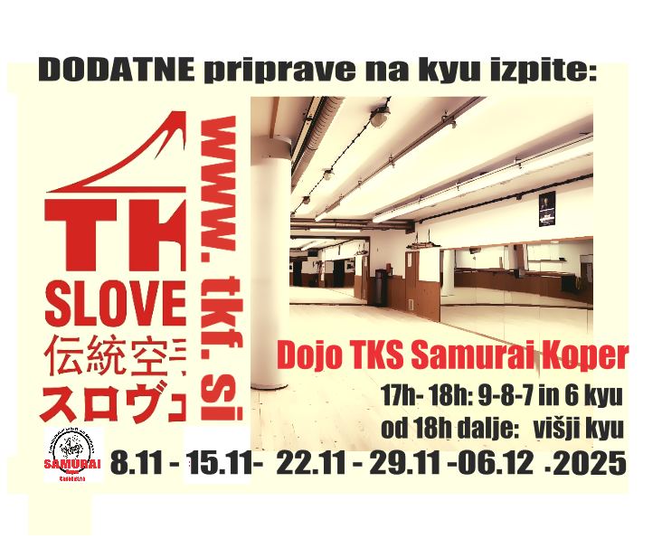 Kyu/DAN izpiti TKF Slovenije v letu 2025 bodo potekali v soboto, 20. decembra na Srednji tehniški šoli v Kopru! Kandidati prejmejo vabila po društvih! Oss!